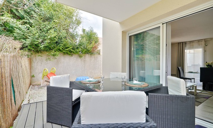 Located on the ground floor, it comprises a lovely 25 m² living room, a fully-equipped kitchen, two bedrooms, a bathroom (with bath) and a private terrace. Wifi (fibre optics), bed linen and towels included, we're waiting for you!