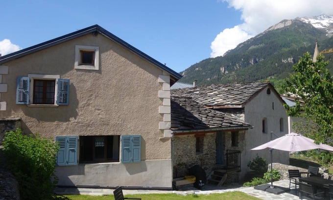 Semi-detached country house, on 2 levels. Ground floor: kitchen, living room with fireplace (wood included), hi-fi system with USB socket, Wifi connection, hallway (access by 3 steps) leading to 3 bedrooms (1 double bed 160 x 200 cm / 2 x 2 bunk beds 90 x 190 cm / 2 single beds 90 x 200 cm), bathroom (shower), separate WC. 1st floor: 2 bedrooms (1 double bed 160 x 200 cm / 2 single beds 80 x 200 cm that can be combined into 1 bed 160 x 200 cm), a bathroom (bathtub with WC). Front balcony. Courtyard / terrace and garden with a stream. Garage for bicycles, motorcycles and skis. Bathroom linen included. Parking on the plot 20 m from the cottage or in front of the house depending on the snow cover. Ski Val Cenis Vanoise at 400 m (free shuttle in winter at 50 m). Also 11 km. Beautiful country farmhouse located 400m from the alpine ski slopes, in the heart of the typical old village. Quiet area benefiting from the proximity of shops and services. Very spacious and bright cottage. Pleasant country character in a country chic style with a lot of charm. Beautiful enclosed stone courtyard serving as a south-east facing terrace. Garden with trees. Traditional wrought iron balcony with a view of the mountains.