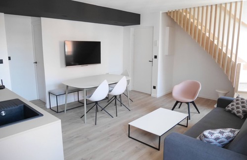 Our largest apartment, Le Flandres is our last floor duplex that can welcome up to 7 people: 2 double bed, one single bed and one sofa bed. It will be perfect for families or groups that want to share a large apartment for their stay. The 2 bathrooms (one with a bathtub) will ease your morning routines, as for every equipment of the apartment made to facilitate your stay: fully equipped kitchen (micro wave, oven, dishwasher, induction hob...), large Smart TVs in each bedroom and in the living room, washing machine etc. Best of all, you will enjoy a very nice view on the Vieux Lille roofs and Sainte-Marie-Madeleine church: splendid !