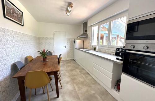 The Gîte du Sequé enjoys an ideal location, between the countryside and the ocean, at the gates of the city for a pleasant stay to discover in any season. The historic center of Dax, the banks of the Adour, the hills of Chalosse, the Landes gastronomy as well as the Landes beaches await you and offer the perfect setting to disconnect and recharge your batteries. Whether for a vacation, for a spa treatment with an adapted price, or for a business trip, the house offers you all the necessary comfort in a rural setting. You will particularly appreciate the fully enclosed 1600m² garden with trees and flowers, the sunny veranda which extends the interior living space, the fully equipped independent kitchen as well as the warm atmosphere of this rental. This independent house is arranged on one level (with two steps at the entrance). It has garden furniture, a barbecue, sun loungers, a parasol. With a surface area of 97m², it can accommodate up to 6 people and a pet. It is composed of: - a living room with lounge (TVn, WIFI) and dining room - a fully equipped kitchen: ceramic hob, electric oven, fridge with freezer, extractor hood, microwave, dishwasher - a veranda - 3 bedrooms: 2 140 beds and 2 90 beds - a bathroom with shower - a separate toilet - a storeroom For your comfort, sheets, towels and household linen are included. Baby equipment (travel cot and high chair) can be provided. Heating package applicable from October to the end of April or May depending on the weather.