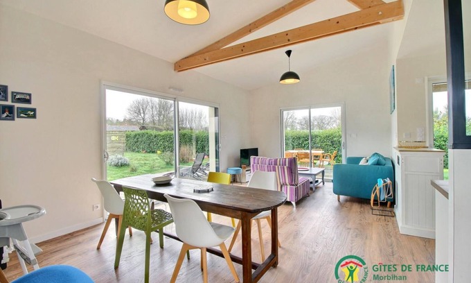 The gite is a beautiful modern vacation rental nestled in a large garden. Arranged on one level, it offers you: a living room open to the outside with fully equipped kitchen, living room and lounge. You will also have two bedrooms (1 bed 140 and 2 beds 90), a bathroom (walk-in shower) and a separate toilet. Outside: a large garden, a wooden terrace with garden furniture, table, deckchairs and electric barbecue. You will also appreciate the ping-pong table for great games with family or friends! You can park your vehicle on the gravelled driveway leading to the cottage. For the deposit, please provide 2 checks: 1 of 650 € for the cottage and 1 of 50 € cleaning deposit. From Redon to Pénestin, the Vilaine stretches forty kilometres, between locks, typical ports and shellfish activities. Hike along the banks of the river or stroll through the rolling undergrowth with stunning views. From the cottage, you can walk to Arzal and the Vilaine river. You will also like to contemplate from the Arzal dam, the dance of the boats which sail between the sea and the river. For swimming, Pénestin, surrounded by the ocean, offers you its 25 kilometers of coastline. Don't miss La Roche Bernard either, a charming city of character with its cobbled streets and its marina!