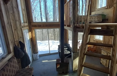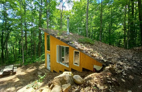 About a 15-minute walk from the parking lot, well insulated on the other side of the mountain, this cottage-refuge is a hobbit-style house with its vegetal roof and interior floor on the Canadian Shield Headland. Comfortable for 2 people