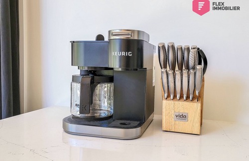 - Well-equipped kitchen with DISHWASHER, hybrid Keurig and filter coffee machine, fondue pot... and plenty of work space for cooking on the luxurious quartz countertop