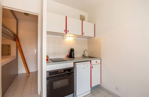 1-room studio 20 m2, on the ground floor. Beautiful furnishings: living/dining room with 1 double sofabed (160 cm, length 200 cm), TV. Sleeping alcove, 2 bunk beds (80 cm, length 190 cm). Kitchenette (2 hot plates, oven, dishwasher, toaster, kettle, freezer, electric coffee machine, Capsules for coffee machine (Dolce Gusto) extra). Bath/WC. Electric heating, boiler (150 litres). Terrace 12 m2, roofed, east facing position, patio 20 m2. Terrace furniture, deck chairs (2). Partial view of the sea and the swimming pool. Facilities: washing machine, iron, hair dryer. Internet (WiFi, extra). Parking space n 21 (fenced). Please note: 1 small pet/ dog allowed. Smoke alarm. Instead of an enclosed bedroom, some sleeping areas are located in an open-plan area (gallery, alcove, etc.). Offer by a private individual according to Art. 155, IV of CGI.