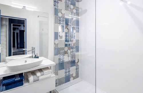 - A bathroom with a large Italian shower, a basin, a towel dryer, a hair dryer and shower gel and/or shampoo available.