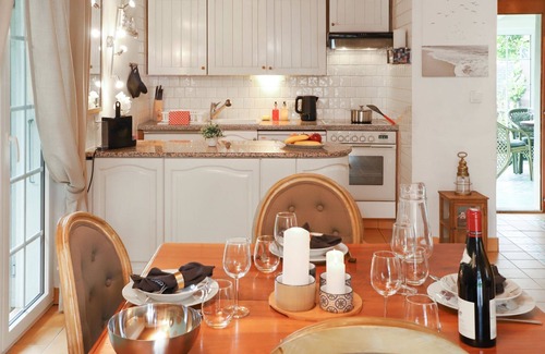 "Le Mas Saphir", 3-room house. Object suitable for 2 adults + 2 children. Comfortable and tasteful furnishings: living/dining room with veranda with open-hearth fireplace and TV. Exit to the patio. Open kitchen (oven, dishwasher, 4 ceramic glass hob hotplates, toaster, kettle, electric coffee machine, Capsules for coffee machine (Nespresso) extra). Shower/WC. Electric heating. Upper floor: 1 room with 1 double bed (160 cm, length 200 cm). 1 open small children's room with 1 x 2 bunk beds (90 cm, length 200 cm). Terrace, small garden. Terrace furniture, electric barbecue (portable). Facilities: washing machine, iron, hair dryer. Internet (WiFi, free). Reserved parking at the house. Please note: non-smokers only. 1 small pet/ dog allowed.