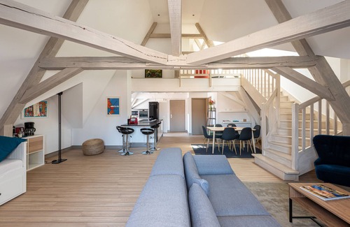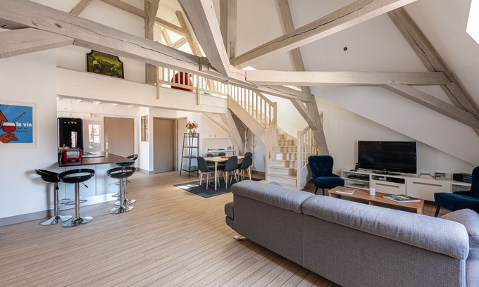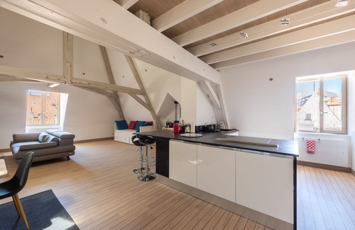 At a 50 meters' distance from the tombs of the Dukes of Burgundy, this 100m2 apartment, located in a very beautiful mansion, has been completely renovated with high standard materials. From the entrance the character of the apartment is given with an incredible volume of the living room. The high-end fitted kitchen opens onto the roofs of the city center. A double bedroom and a bathroom take place on this level. On the first floor, a loggia where to relax, a shower-room and a second double bedroom are superb!