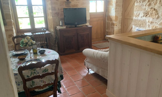 Cozy renovated thirteenth century gite. Original features retained but all modern comforts privied such as air-conditioning and wi-fi. There is a stunning professionally designed garden to relax in with a clear view of the night sky - perfect for stargazing. Peaceful and calm yet a short walk to friendly local, The Black Duck pub and restaurant. Here you can drink the local aperitif or order a draft Guinness! The gite is ideally situated between Sarlat and Montignac, and only a short drive to the Dordogne river. The valley of the Lot is also close by where you can discover the beautiful Rocamadour and the market town of Soulliac.