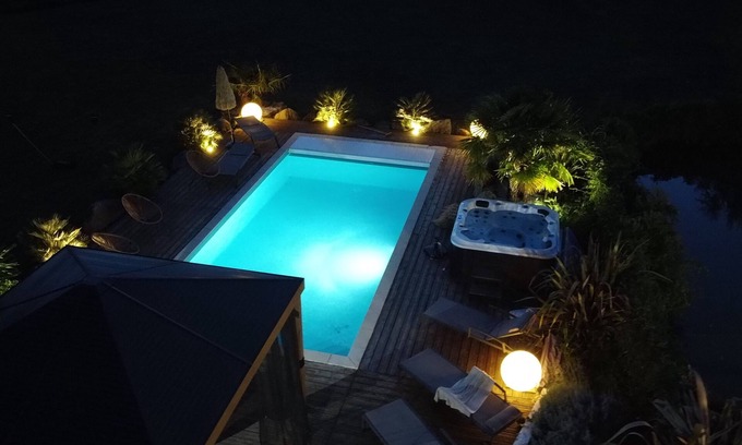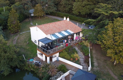 An equipped kitchen, 2 bathrooms, one of which has a spa bath, 2 toilets, a games room with billiards and table football, a 4-seater sauna, and several terraces at different levels with a view of the ponds, barbecue and brasero.