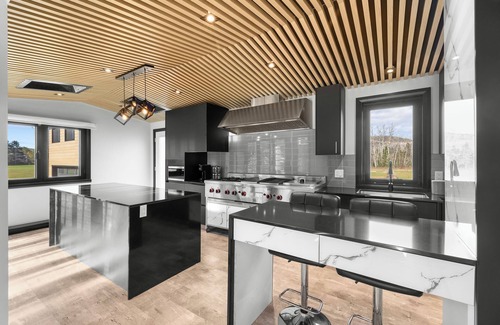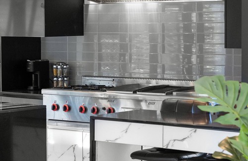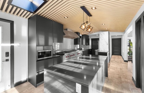 Cuisine de chef : Cuisine moderne avec des électroménagers industriels haut de gamme (réfrigérateur double, cuisinière professionnelle, lave-vaisselle rapide), idéale pour préparer des repas mémorables.