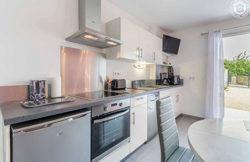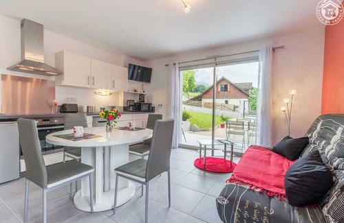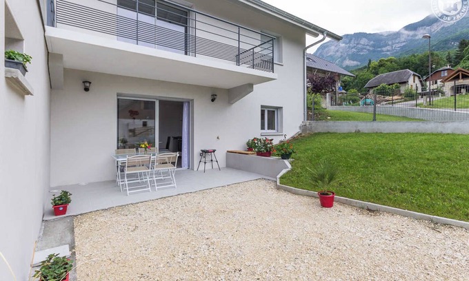 Gite in a house with 2 apartments. Ground floor (independent access and on one level): living room-kitchen lounge area (1 sofa bed for 1 person), Wifi connection, one bedroom (1 double bed 140 x 190 cm), shower room with WC . Private washer-dryer. Sheltered terrace with garden. Alpine skiing + cross-country + snowshoeing Le Revard 19 km, la Féclaz 22 km. Bourget lake beach 7 km. Chevalley thermal baths 3 km away, Marlioz thermal baths 4.5 km away. Beautiful contemporary house located in a residential area, 3 km from the Chevalley thermal baths in Aix les Bains. Very close to forests with marked trails. Gite on one level and very comfortable. Contemporary stamp and very neat. Beautiful sheltered terrace with garden furniture and deck chairs.