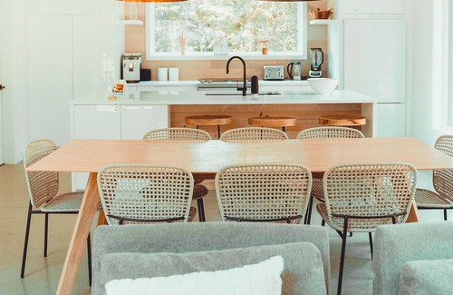Le Zen House contient 3 chambres, 2 salles de bains, salon avec foyer au gaz, grande cuisine avec ilot et un deuxième salon à l'étage.