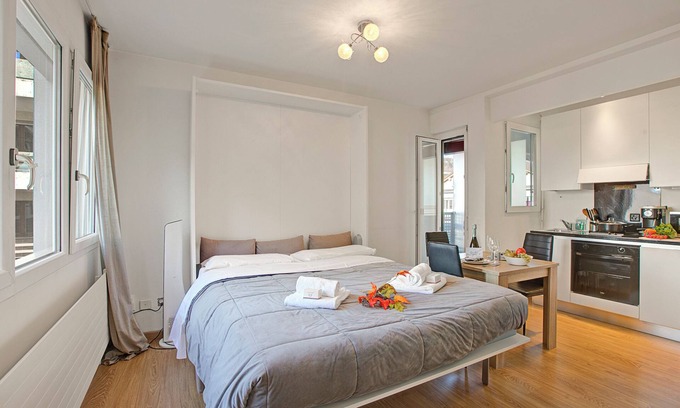 Situated at easy walking distance from the buzzing centre of Lugano, this bright balcony studio with all essential amenities ensures an effortless self-catered stay and a carefree vacation. The fourth-floor apartment has luminous interiors that directly give out onto the balcony. There is a single sofa bed with a coffee table and a large flat-screen TV to unwind after a day of exploring the lake or the city.