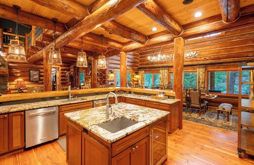 Gather into this 9000 sf custom log home. Main floor includes 3 ensuite bedrooms with laundry adjacent. Old Hickory furnished living room with soaring rock gas fireplace. Baby Grand Piano in entry. kitchen with bar seating surrounding it, incredible coffee bar, dining room overlooking river, game room with fireplace, pool table, games/puzzle table, giant wall Scrabble, Golden Tee, assorted board games and our fabulous River Pub bar. All spaces furnished with your comfort in mind.
