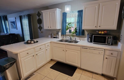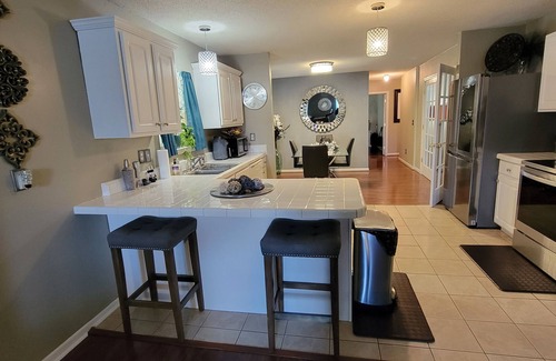 This home is located in a quiet, family oriented neighborhood that is perfect for taking an early morning walk or a late evening jog. A nice spacious remodeled tennis court is located about 4-5 minutes walking distance, with a newly remodeled baseball field next to it. Moving on to the home, when you enter the front door of The Leisure Time Abode, you will be welcomed with a well lite living room area with french doors. Need to take a load off, feel free to take a seat in the living room area and ask Alexa to play the calming sound of rain or white noise. If you like tranquility then you will love the amazing jetted jacuzzi tub located in the master bedroom along with a comfy king sized bed accommodated by a 46 inch flat-screen television as well as a 4k firestick for your viewing pleasure. Next to the master bedroom are the two other bedrooms with queen sized beds. Both are equipped with flat screen televisions and 4k firesticks as well. The dining room area has a 4 person dine in table next to the kitchen that has a 2 person breakfast bar. The kitchen is furnished with all stainless steel appliances and a knock knock fridge that lights up when a knock had been detected. Next up is the den area. Located here is Echelon cycling bike just incase you would like to burn a few calories while taking in a movie. A spacious sectional couch, fireplace and 70 inch flat-screen with 4k firestick is located here also. Finally, the outdoor screened in porch, such a peaceful environment. It is furnished with plenty seating, ceiling fan, amber ceiling lights for when it gets a little dark, accommodated with a large backyard area. Get for kids that need to run around and burn off a little energy...