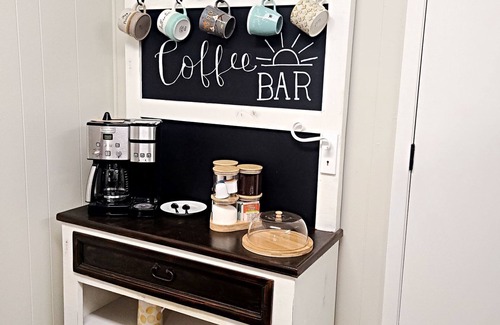 Our fully furnished kitchen includes modern stainless steel appliances. A glass cooktop, microwave oven, blender, air fryer and everything needed to cook a meal. There is seating for four two places at the bar and 2 at the table. Help yourself to our well stocked coffee and tea bar.
