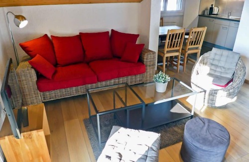 "Les Bruyères 25", 2-room penthouse 42 m2 on 2nd floor. Comfortable and beautiful furnishings: living/dining room with open-hearth fireplace (only for decoration), TV (flat screen), DVD. Exit to the balcony, south facing position. 1 room with 1 x 2 bunk beds, 1 double bed (160 cm). Open kitchen (oven, dishwasher, 4 ceramic glass hob hotplates, toaster, kettle, microwave, electric coffee machine, Capsules for coffee machine (Dolce Gusto) extra, raclette grill, combination microwave, fondue Set (cheese)). Bath/WC. Small balcony 6 m2. Balcony furniture. Very beautiful view of the mountains. Facilities: Internet (WiFi, free). IPod docking station. Garage space n 25.