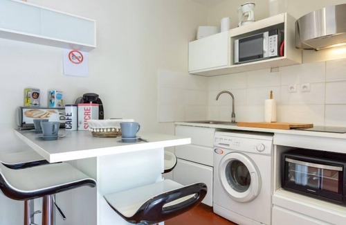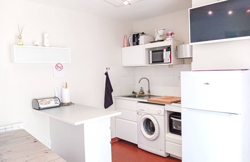 2-room apartment 29 m2, on the ground floor. Simple furnishings: living/dining room with 1 double sofabed (140 cm, length 190 cm), TV (flat screen), fan. Exit to the terrace. 1 room with 1 french bed (140 cm, length 190 cm), fan. Exit to the terrace. Kitchenette (mini-oven, 4 ceramic glass hob hotplates, toaster, microwave, freezer, electric coffee machine). Shower/WC. Electric heating. Terrace 15 m2. Terrace furniture. Facilities: washing machine. Internet (WiFi, extra). Parking space n 116. Please note: smoke alarm. FR6640270.4