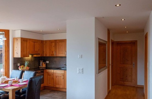 "Les Cimes Blanches B 401", 4-room apartment 100 m2 on 4th floor. Comfortable and tasteful furnishings: living/dining room with open-hearth fireplace, cable TV and DVD. Exit to the balcony. 1 room with 2 beds (90 cm, length 190 cm). 2 rooms, each room with 1 french bed (180 cm, length 200 cm). Exit to the balcony. Open kitchen (oven, dishwasher, 4 ceramic glass hob hotplates, toaster, kettle, freezer, electric coffee machine, Capsules for coffee machine (Nespresso) extra, raclette grill, fondue Set (cheese)). Bath/WC, shower/WC. 3 balconies, north facing position and south facing position, east facing position. Balcony furniture. Beautiful view of the mountains and the resort. Facilities: washing machine, dryer, children's high chair, baby cot, hair dryer. Internet (WiFi, free). Garage, height 200 cm, width 230 cm. Please note: non-smoking house.