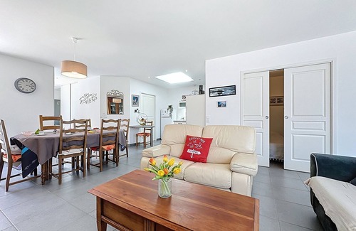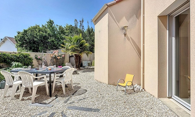 Single-family house "Les Embruns". In the centre of La Bernerie en Retz, excellent location: right in the centre but still quiet, 250 m from the sea, 250 m from the beach, west facing position. Private: property 300 m2 (fenced), garden 210 m2 (fenced). Garden furniture, barbecue, parking. Shop, supermarket, restaurant, bakery, café 350 m, 4 minute walk to the centre, bus stop "Bourg (Navette Estivale)" 300 m, railway station "La Bernerie en Retz" 600 m, sandy beach "Grande Plage" 350 m, thermal baths "Alliance Pornic Thalasso & Spa" 8 km. Golf course (18 hole) 10 km, tennis 200 m, minigolf 10 km. Nearby attractions: Marché de la Bernerie en Retz 400 m, Pornic Aventure Accrobranche 8 km, Port du Collet 11 km, Planète Sauvage 26 km, Les Machines de l'Ile - Nantes 45 km, Noirmoutier 54 km. Well-known lakes can easily be reached: Lac de Saint Viaud 23 km. The keys‘ handover takes place by the agency Interhome in Pornic, 7 km.