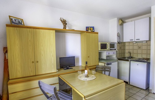 1-room studio 18 m2 on 1st floor, south-east facing position. Practical and beautiful furnishings: living/dining room with 1 double sofabed (140 cm, length 190 cm), dining table and TV (flat screen). Exit to the balcony. Entrance hall with 1 x 2 bunk beds (80 cm, length 190 cm). Open kitchen (2 hot plates, mini-oven, toaster, kettle, microwave, freezer, electric coffee machine). Shower/WC. Electric heating. Small balcony 6 m2. Balcony furniture. Facilities: iron. Internet (WiFi, extra). Parking space n 30. Please note: non-smokers only. TV only FR. Smoke alarm, no lift. Fan. 83019 000444 OA