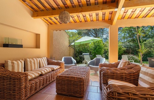 Villa "Les Mimosas". Property composed of main house and outbuilding, outside the resort, 4 km from the centre of Cogolin, 2 km from the sea, in the countryside. For shared use: 2 swimming pools angular (20 x 10 m, seasonal availability: 01.May. - 30.Sep.). Children's pool, tennis, boccia. Private: well-kept garden, swimming pool (8 x 4 m, depth 100 - 180 cm, seasonal availability: 01.Apr. - 30.Oct.) with alarm system. Shop, grocery 800 m, supermarket 1 km, restaurant 1 km, bakery 800 m, bus stop "Font Mourier" 900 m, sandy beach "Marines de Gassin" 2 km. Sports harbour 2 km, sailing school 2 km, minigolf 2 km. Nearby attractions: Parc d'attractions Azur Park 2 km, Port Grimaud 3 km, Saint Tropez 10 km, Pampelonne 10 km, Cannes 84 km, Nice 110 km. Well-known lakes can easily be reached: Le lac de Sainte Croix 92 km. Hiking paths: Le Massif de l'Esterel 50 m. Please note: car recommended. Residence with electric gates. residence has security.