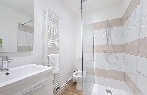 Salle de bain avec vasque , sèche-serviette, wc et douche à l'italienne.