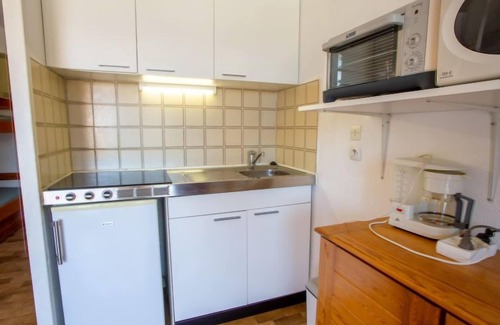 1-room apartment 19 m2 on 1st floor. Object suitable for 2 adults + 2 children. Simple furnishings: living/dining room with 1 double sofabed (140 cm, length 190 cm), TV (flat screen). Exit to the balcony. Entrance hall with 1 x 2 bunk beds (70 cm). Kitchenette (mini-oven, 3 induction hot plates, toaster, kettle, microwave, electric coffee machine). Bath/WC. Electric heating. Small balcony 5 m2, east facing position. Balcony furniture. View of the swimming pool. Facilities: Internet (WiFi, extra). Garage space n 378, height 180 cm, width 200 cm. Please note: maximum 1 pet/ dog allowed. TV only FR. Smoke alarm. 83019000603CZ