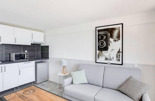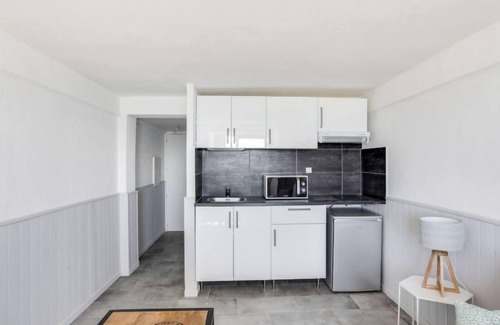 1-room studio 20 m2, on the ground floor. Simple and beautiful furnishings: living/dining room with 1 double sofabed (140 cm, length 190 cm), dining table and TV (flat screen). Kitchenette (2 ceramic glass hob hotplates, toaster, kettle, electric coffee machine, combination microwave). Shower/WC. No heating option. View of the sea. Facilities: Internet (WiFi, extra). Please note: no parking. Maximum 1 pet/ dog allowed. TV only FR. Smoke alarm. 8307000091231