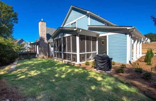 - Screened in porch with outdoor fireplace, flat screen tv, and comfy dining and living spaces