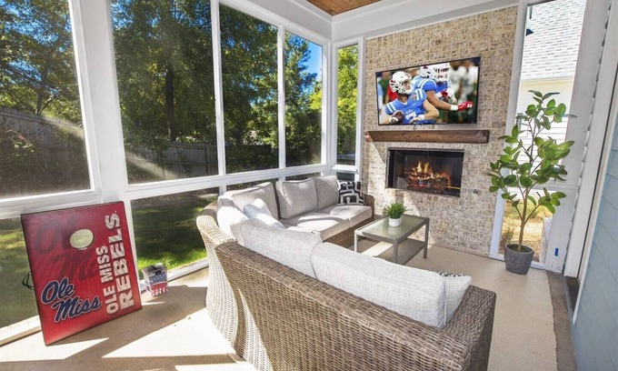 - Screened in porch with outdoor fireplace, flat screen tv, and comfy dining and living spaces