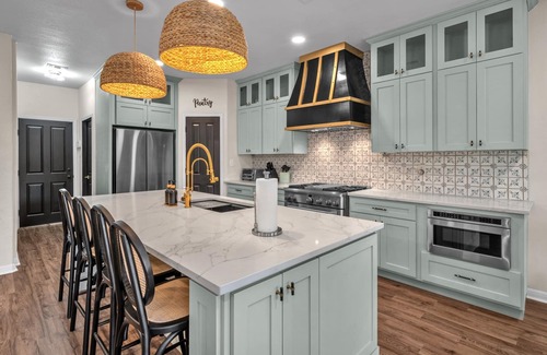 Step into our newly designed open kitchen, a true masterpiece for food enthusiasts. The space is adorned with top-tier GE Monogram Professional Series appliances, ensuring a seamless cooking experience. The stunning quartz countertop not only provides ample workspace but also offers seating for four on elegant rattan cafe stools, creating a perfect spot for casual dining or socializing.