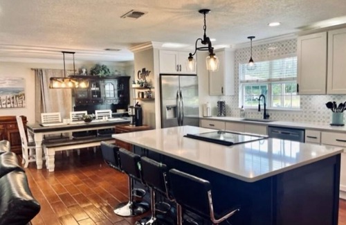 Step inside to the 'anchor' and art entry with a 2 cushioned benches and a console table. To the right step through the large entry into the 'great room'. The kitchen area has sleek white shaker cabinets with crown molding and black hardware handles, marble stone tile backslash in a basket weave pattern, and quart countertops in dusty grey. The open kitchen design has Frigidaire Gallery stainless appliances: quiet dishwasher, oven/stove and side by side refrigerator. The spacious island is functional and makes cooking enjoyable with the conduction cooktop, convection oven and counter-level microwave. The island has 4 cushioned adjustable barstools. Share time together with the openness of the family room, including a large smart tv in a wall entertainment center, a black leather sectional with electric reclining, and deep grey upholstered chairs. To the side of the kitchen share a meal together at the large farm table with seating for 8, a China hutch, buffet and coffee station. There is another table that seats 4, to use for dining or as a game table. We have games in the entertainment center and in the closet of the King size bedroom.