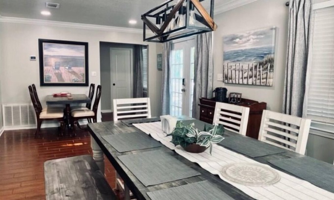 Welcome to our Cottage home newly listed and remodeled perfect for a group of family or friends -up to 10 (8 adult maximum) looking to have a wonderful time! (Minimal Guest fees applies for guests beyond 6) You can access the Aqua CC interior using your own door code, enjoy free Wi-Fi and TVs with Roku ready for your entertainment. Our home is well equipped with 4-bedrooms and 2 and a half baths, new kitchens and baths, an open floor plan including crown molding ceilings in the main area. Relax with the privacy of the half-acre lot with wooded lots on the back and north side. Enjoy watching the sun come up from the front porch with a view of the beautiful Magnolia tree or the nurtured gardens and Live Oak trees east of the home. Out the French doors to the large side deck you can enjoy time outside with a BBQ grill and an outdoor dining table complete with an umbrella. Down the stairs, you will find an enclosed porch with wood slats, where you can have privacy to relax in the jetted hot tub. Read the Welcome Guide to locate the hot tub key.
