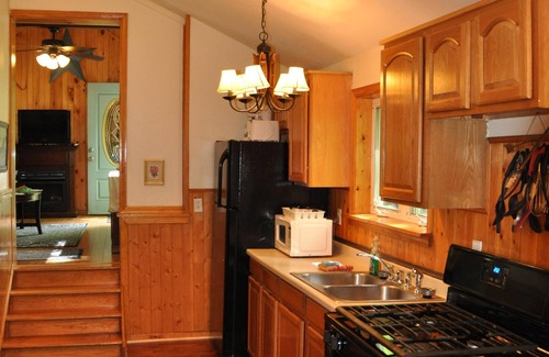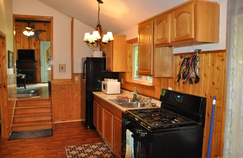Just off the living room (down three stairs) is the kitchen, where you can prepare your day's meals. Enjoy the full-size gas stove/ oven, refrigerator, and dining for four.