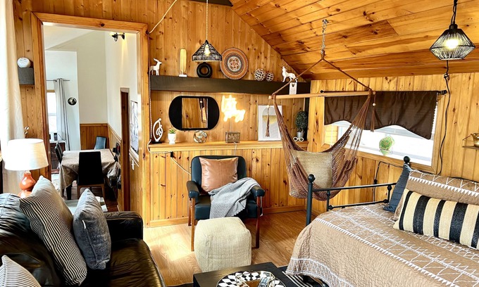 Open the front door and step into the cozy living room. This cottage has tall ceilings, pine walls, and modern decor. Cozy up while resting on the sofa, chair, or indoor hammock. The indoor hammock is perfect for relaxation, no matter the weather outside. We provide a tv (no live tv, you may sign in to your own streaming services). The twin-size daybed with trundle is nestled in the living room for a comfortable stay for the additional guests. Winter nights are especially cozy. With the gas fireplace on, you are in the perfect spot to snuggle in and enjoy the day with friends and family.