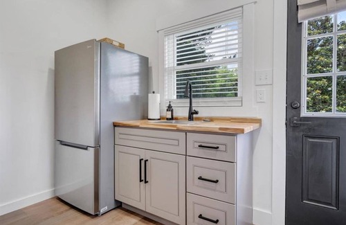 Originally built in the early 1900s, the farmhouse has been lovingly restored to preserve its character— original hardwood floors and antique accents—while incorporating all the amenities you need for a luxurious stay. The updated kitchenette features a full size refrigerator, dishwasher and microwave (no oven or stove top) .