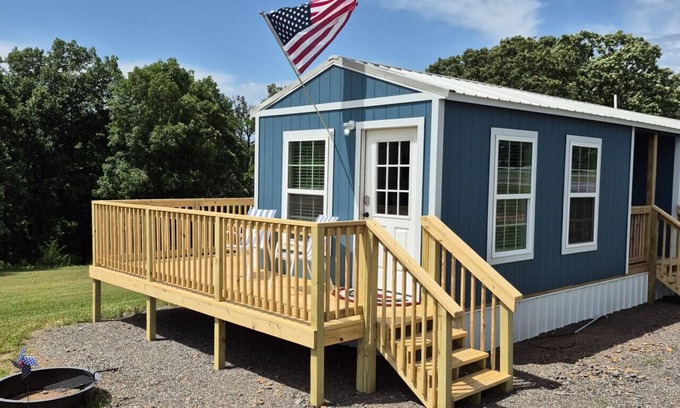 Welcome to Liberty Nook, a one-of-a-kind Tiny Home with a cozy America decorated feel. The unique all American feel inside will transport you to a simpler, more peaceful lifestyle. Located in the beautiful countryside of Northeast Oklahoma, you'll be surrounded by nature and tranquility. Take a stroll to our large pond and try your hand at fishing or take in the beauty of our mile-long hiking trail. And don't forget to bring your furry friend along – we have a brand new 5,000 square foot pet park for them to play and explore. Looking for a little friendly competition? Head over to our new pickleball court for some outdoor fun. We can't wait to welcome you as our guest at Liberty Nook, where you'll feel right at home in the great outdoors.