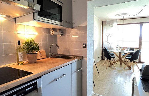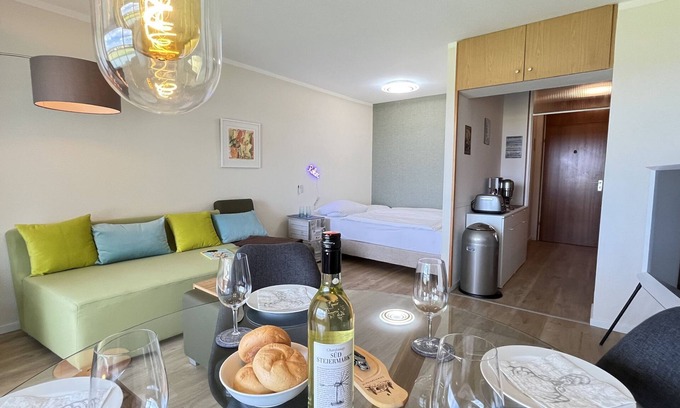 "Lichtblick", 1-room apartment 36 m2, on the ground floor. Bright, partly renovated in 2024, modern and tasteful furnishings: living/sleeping room with 1 sofabed (80 cm, length 200 cm), 1 double bed (2 x 80 cm, length 200 cm), satellite TV (flat screen). Exit to the balcony. Kitchenette (dishwasher, 2 induction hot plates, toaster, kettle, electric coffee machine, combination microwave). Shower/WC. Heating. Balcony. Balcony furniture. Beautiful view of the countryside. Facilities: Internet (WiFi, free). Parking (1 car) at the house. Please note: non-smokers only. Maximum 1 pet/ dog allowed. Smoke alarm. The balcony is glazed. The double bed (box spring) consists of two bed sections (80 x 200 cm each), which can be pushed apart and configured as single beds if required.