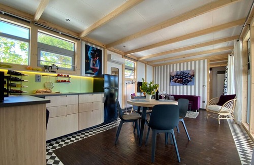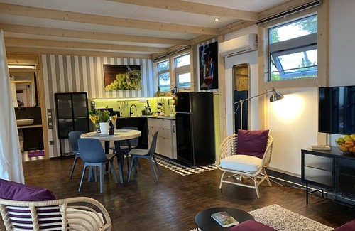 This 2-bedroom, 1-bathroom rental features a living room, a dining area, and air conditioning. Bathroom amenities include a hair dryer, towels, and toilet paper. The kitchen is equipped with a stovetop, a refrigerator, and a dishwasher, as well as a coffee maker, an electric kettle, and a microwave.