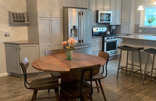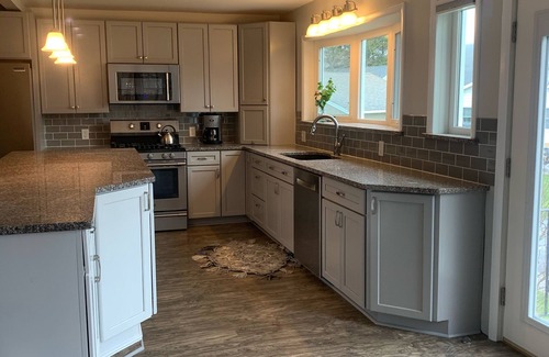 The home has a brand new, updated kitchen, with state of the art appliances. The kitchen, dining , and living room is open concept, which is perfect for family retreats. The two bedrooms are spacious, and there’s a pop up couch in the living room. The backyard is a 1/2 acre and is fenced in - ideal for our 4 legged family members. There’s a shared side road that serves 11 houses, so it’s nice and peaceful, and everyone has their own lake frontage.
