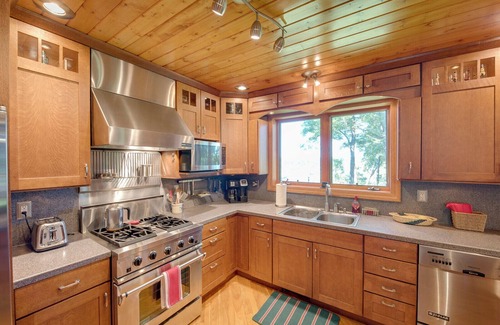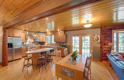 The wooded lot includes a log home with three bedrooms, three bathrooms, and many unique amenities. (The 4th bedroom -- aka, the "secret" room -- is described later.) The kitchen includes all stainless steel appliances and a charcoal grill is available for your use on the back patio. The pantry is well stocked with spices, oils, and condiments, and guests are welcome to a bottle of wine from the underground wine cellar. In addition to the open kitchen/dining area, living/game room with a fireplace, bedrooms, and bathrooms, the home includes two large "dojos" that can be used for weight lifting, yoga, meditation, or martial arts. The property also offers unique hiking opportunities. Our more adventurist guests will want to explore the decades-old logging path down to the river. Internet and Wi-Fi access is included.