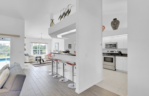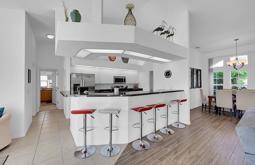 The modern kitchen is separated from the great room by a long breakfast bar with seating for six people. It has all quality stainless steel appliances, a fridge with chilled water and ice maker, dishwasher, microwave and cooker, plus electric kettle, filter coffee maker and even a bread maker. There are plentiful cooking utensils and classic white tableware, plus pool crockery and glasses.