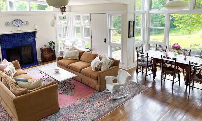 Experience idyllic country living at White Rock Cottage, near the village of Millbrook. Relax on a tranquil, private 5 acres. Inside the house you'll find a spacious living room with dueling sofas, perfect for leisure and entertainment by the fireplace. The space is naturally sunlit and bright during the day, thanks to a glass wall and high ceilings. The house is furnished with a blend of antiques and new pieces, and there is a generous offering of books and games for you to enjoy. There are also many toys and books for young children, and a Baby Bjorn pack and play is available upon request.