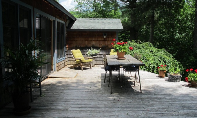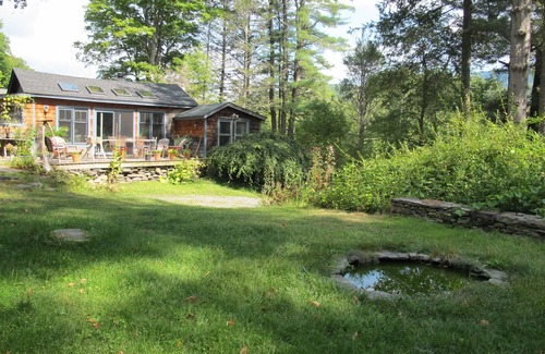 Magical, this property sits on three acres w/ groomed flower gardens and abuts state forest. It is private yet only 3 min to the hamlet of Phoenicia. Miles of hiking are right behind the house. The house has three bedrooms with queen size beds. There is a single bed by the wood stove. The great room (living , dinning, kitchen) is filled with sunlight and opens to a large deck with bird feeders that get plenty of guests. Great walking on path along the river. Near skiing areas!