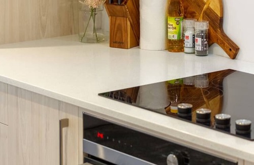 The kitchen is fitted with modern appliances, cookware, and all the essentials for preparing meals. It also includes extras like instant and plunger coffee, black and peppermint tea, drinking chocolate, milk, sugar, salt, pepper, and sweet treats.