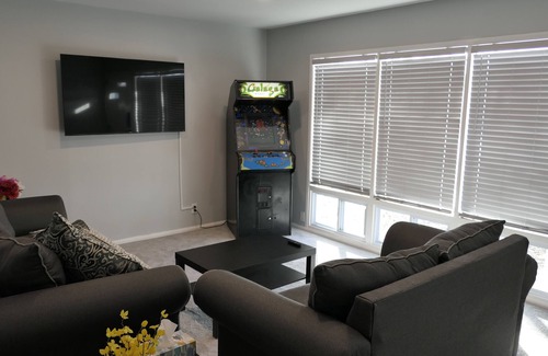 Lil' Grand's cozy living room contains a 58" Roku TV equipped with 'guest mode' so you can safely sign in to all your streaming apps yet leave with the certainty that each one will automatically be signed out upon your departure based on the date you set yourself. Additionally, an updated and restored 1980s vintage "Galaga" arcade game sits in the corner of the room (volume only on when game is in play mode) that hosts 60 vintage arcade games. For our guests, free play is set the entire time. Don't want to use it? Simply unplug it! A plush couch and love seat offer comfortable relaxation. Several beautiful, large windows offer plenty of natural light if you so desire.