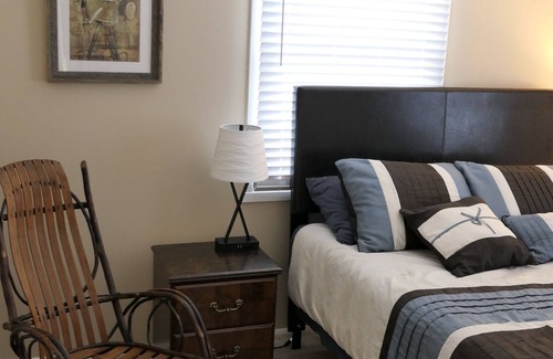 The QUEEN bedroom contains a 50" Roku TV equipped with 'guest mode' so you can safely sign in to all your streaming apps yet leave with the certainty that all will automatically be signed out upon your departure based on the date you set yourself. In addition, this room contains one new, queen firm memory foam mattress, two traditional nightstands with drawers, a vintage storage cabinet, a rocking chair, a portable fan, extra pillows, sheets, blankets, and a luggage rack.