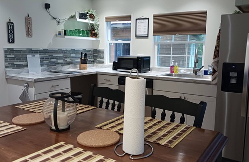 The home has 2 bedrooms, each equipped with a queen bed, 2 full bathrooms and a spacious well-equipped kitchen with dining area. It is ideal for 2 couples, friends or a family of 4. As a bonus, there is a washer and dryer for all your laundry needs. Across the street from the lot spans a long stretch of now-unused historical train tracks.