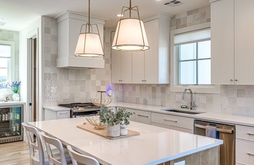 The living room flows openly into the kitchen and dining area where there is seating for up to 14 guests. Upgrades that make this the perfect kitchen for your group include a large fridge and freezer plus an additional beverage fridge, a gas range stove and a dual oven with seperate upper and lower cooking capabilities. The cabinets are unsparingly stocked with dishes, cookware and appliances. A unique layout provides abundant counter and cabinet space to store groceries or serve meals to a large group.